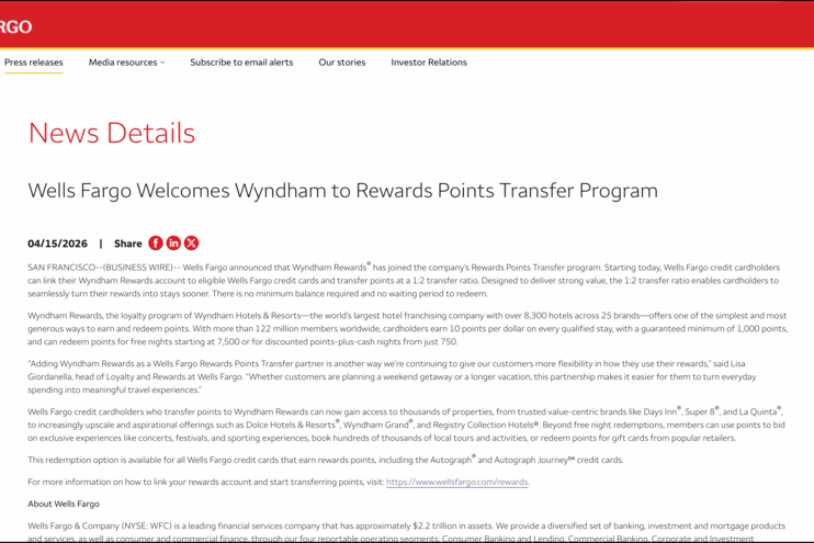 Details Written by: RJ Wells Fargo has added Wyndham as a transfer partner. Points transfer at a 1:2…