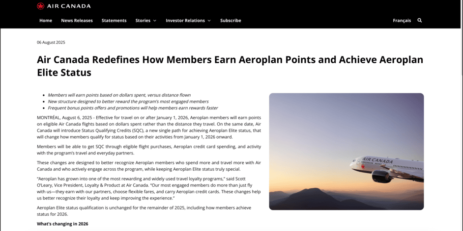 Air Canada has announced changes to the loyalty program effective 1/1/26: