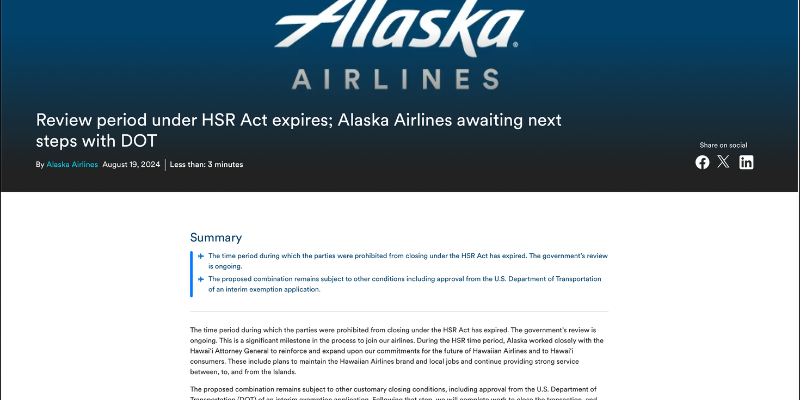 First draft: “The time period for the U.S. Department of Justice to complete its regulatory investigation of the proposed combination of Alaska Airlines and Hawaiian Airlines under the HSR Act has expired,”