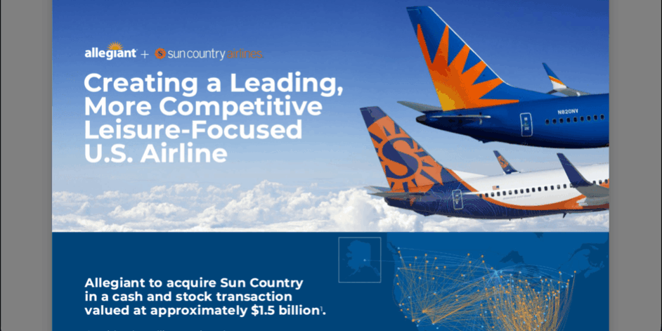 Allegiant Airlines has announced the acquisition of Sun Country. This is cash and stock deal valued at ~$1.5B. Both airlines will fly under the Allegiant banner.