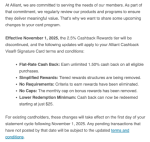 Alliant Credit Union is cutting their Cash Back Rewards card from 2.5x down to 1.5x. This will go into effect 11/1/25.