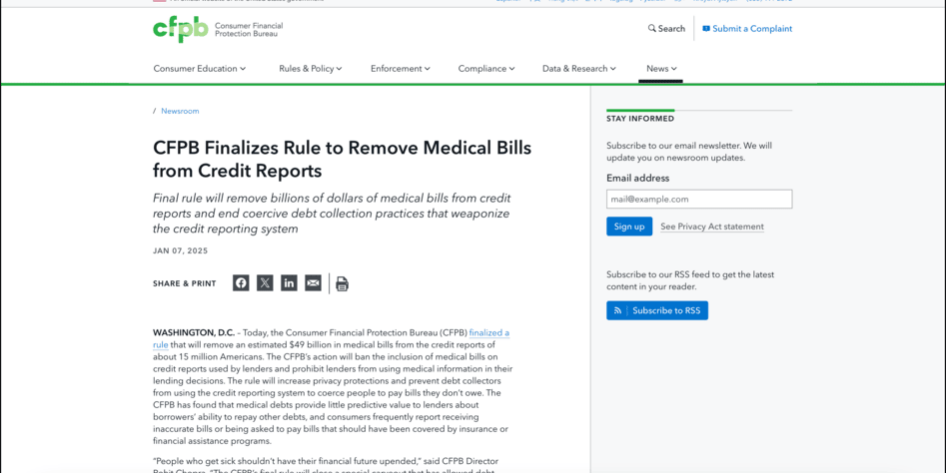 WASHINGTON, D.C. – Today, the Consumer Financial Protection Bureau (CFPB) finalized a rule that will remove an estimated $49 billion in medical bills from the credit reports of about 15 million Americans. The CFPB’s action will ban the inclusion of medical bills on credit reports used by lenders and prohibit lenders from using medical information in their lending decisions. The rule will increase privacy protections and prevent debt collectors from using the credit reporting system to coerce people to pay bills they don’t owe. The CFPB has found that medical debts provide little predictive value to lenders about borrowers’ ability to repay other debts, and consumers frequently report receiving inaccurate bills or being asked to pay bills that should have been covered by insurance or financial assistance programs.