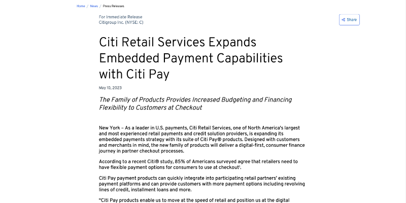 According to Citi, 85% of Americans believe stores should offer flexible payment options. This is basically another credit card, almost like a store credit card that you can use more retailers (depending on which choose to participate). In place of rewards, you get special financing options. Targeted at competing with the buy now pay later services.
