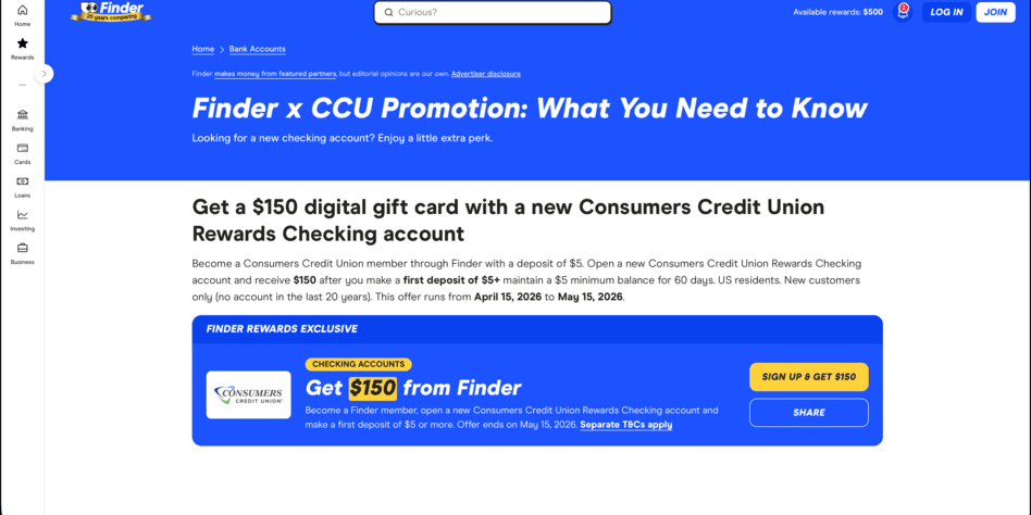 - Open a new Rewards checking through Finder *hard pull*