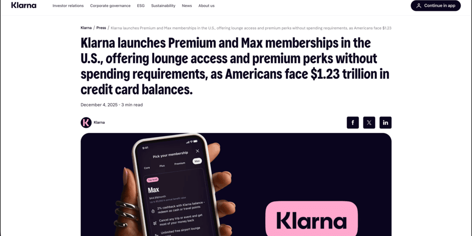 Klarna’s memberships deliver premium perks, including airport lounge access, travel insurance, and lifestyle subscriptions, without taking on debt or hitting a spending requirement.